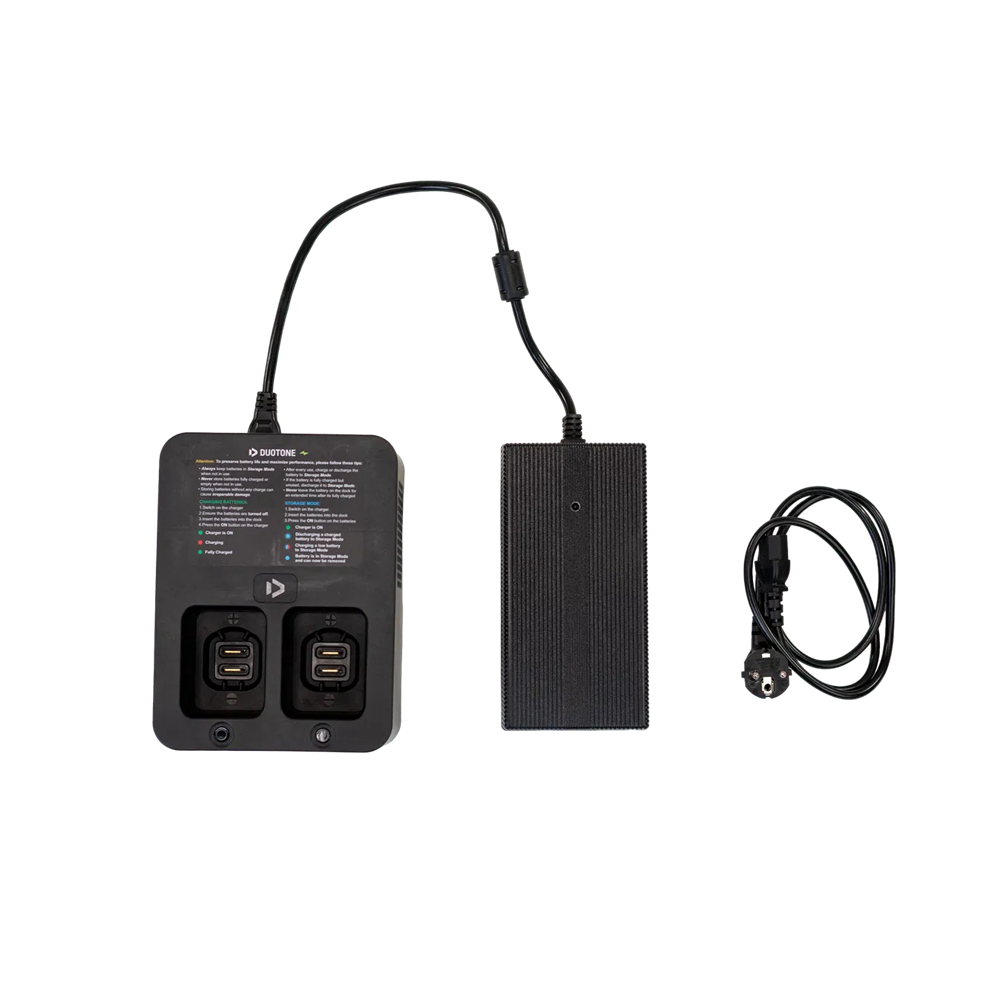 The charger is specifically designed for the Foil Assist batteries and can hold up to two batteries at once. If you don't plan to use the batteries again that day, we recommend charging or discharging them to about 50% (2-3 LED lights). This prevents over-discharge and ensures they last longer. Another advantage of this charge level is that you will need less time to fully recharge the batteries.