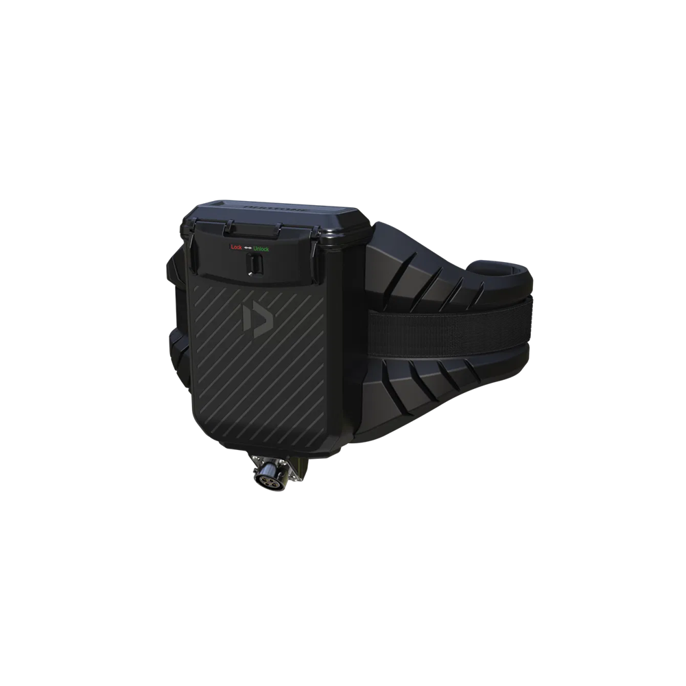 Unlike conventional systems that mount the batteries on the mast top plate or the board, the Duotone Foil Assist batteries (2 x 1 kg) are placed in a waterproof box attached to a comfortable waist harness. This arrangement ensures that the board-foil setup remains perfectly balanced despite the motor, preserving the pure feel of foiling as much as possible. A backpack with batteries has the disadvantage of placing weight on the shoulders, which can disrupt balance during turns and quick movements. With the harness, the weight sits on the hips, where it does not affect your balance, and you have full freedom of movement in your upper body. You will hardly notice the weight of the harness (approximately 3.76 kg, including the box and batteries) after just a few minutes.