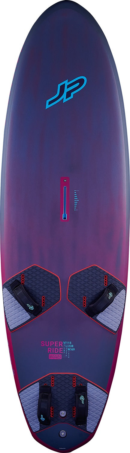 The Super Ride features a wider tail and overall width, creating a stable platform with a big planing area. This design, combined with an efficient rocker line, supports early planing and ensures smooth performance in different conditions. The shape reduces drag and improves efficiency, allowing the board to plane in a higher water position for a smooth ride and consistent control, even in choppy water. This balance of stability and responsiveness enables confident acceleration and high-speed windsurfing.