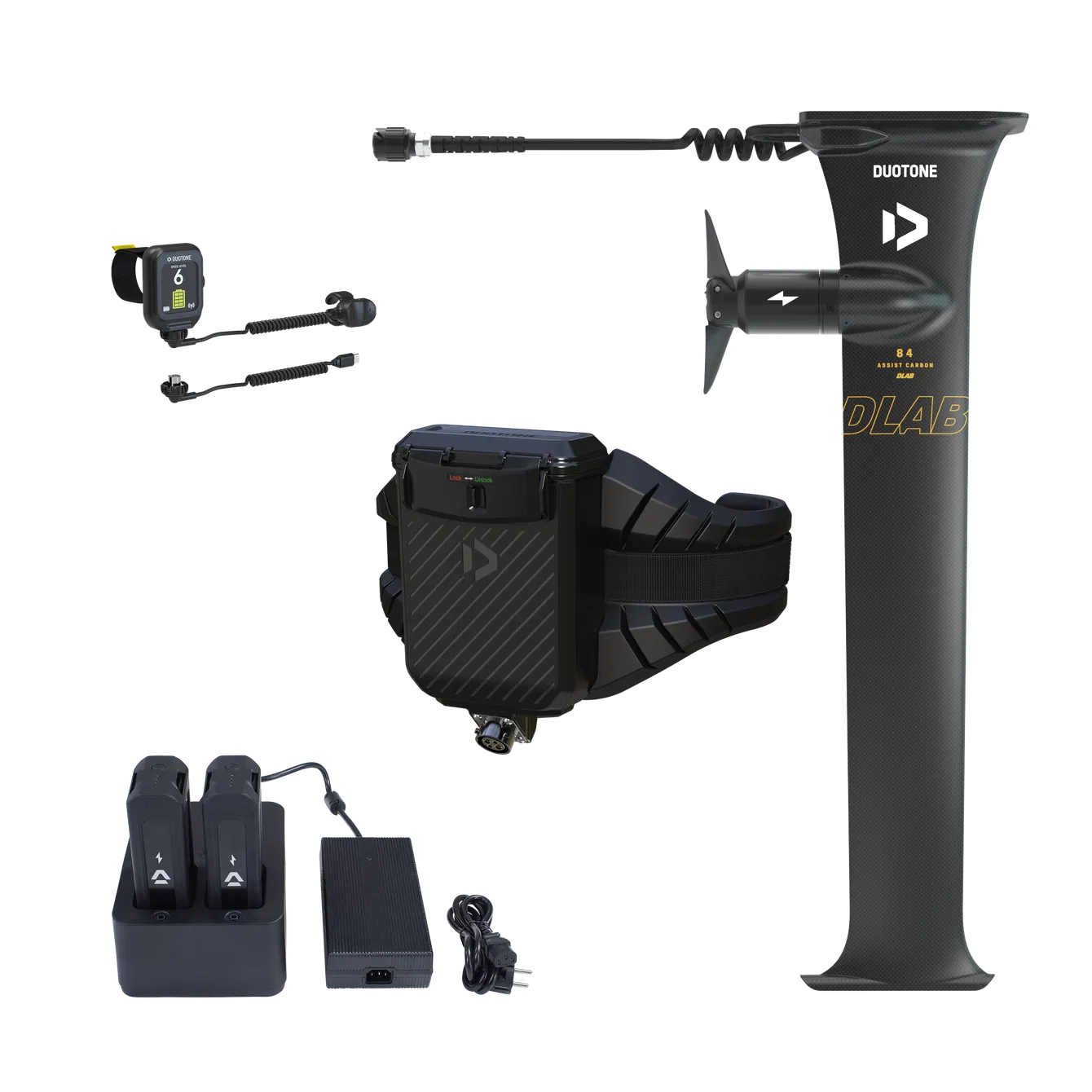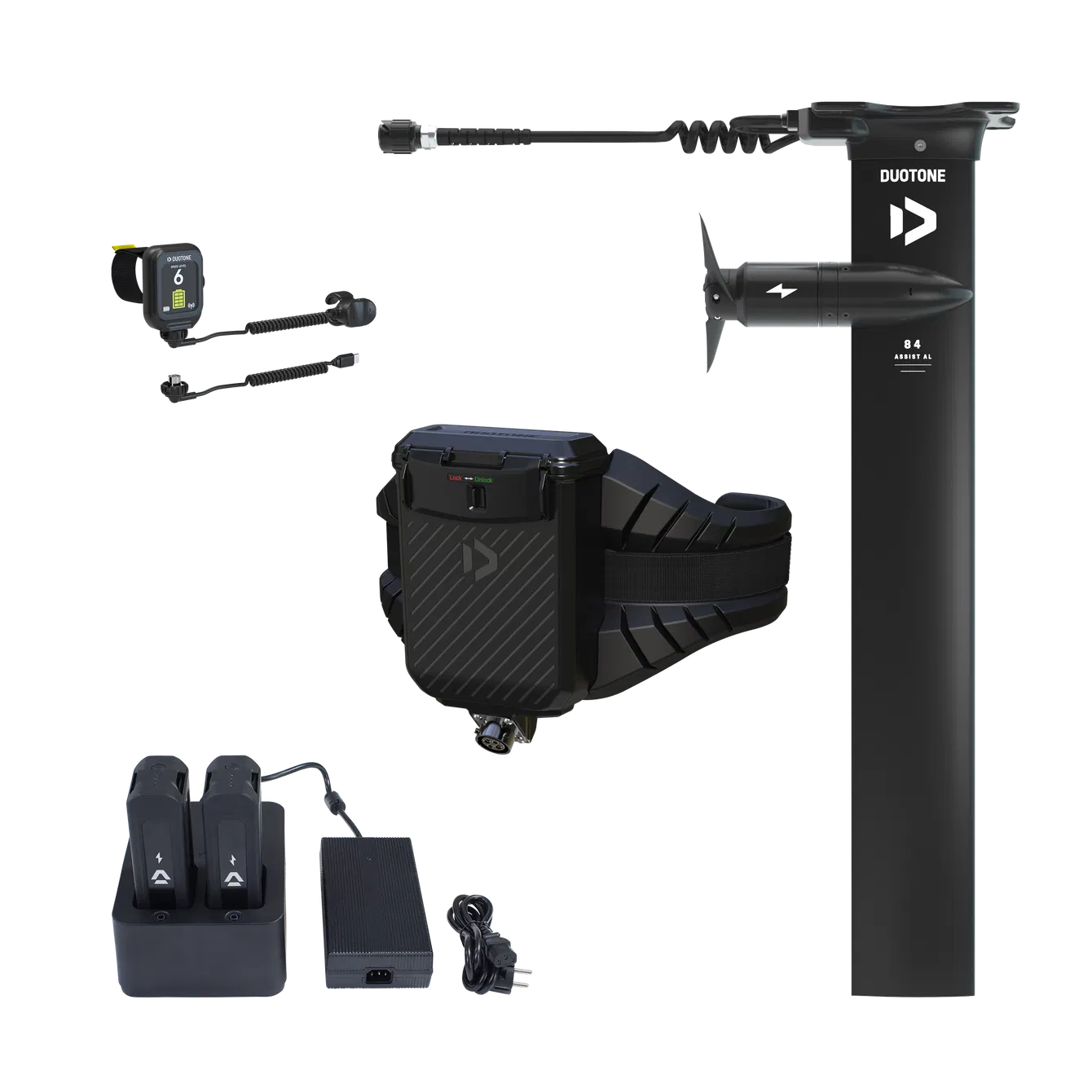 The Foil Assist is powered by two compact batteries housed in a waterproof box mounted on a lightweight eHarness (approx. 3.76 kg). This keeps your board free from extra weight and drag. With the batteries placed on your hips, the natural, fluid feel of foiling is preserved while still giving you full freedom of movement. The eHarness is buoyant and easy to remove. A cable runs neatly along the shorter board leash and connects the batteries to the eMast. The receiver integrated into the battery box ensures a stable and reliable connection between the remote and the motor throughout your entire session.